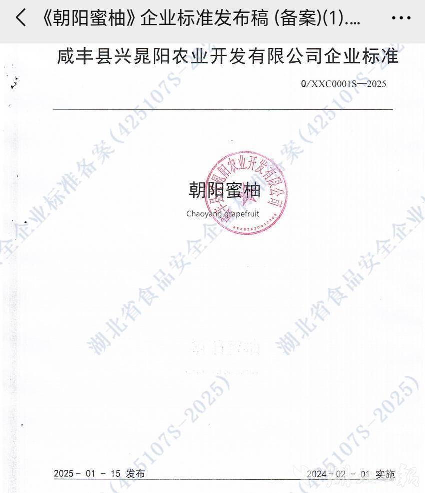 高标准铸就“硬核实力”。朝阳蜜柚已于2025年1月15日在湖北省卫健委完成了食品安全企业标准备案。该标准为果品在糖度、安全性等关键指标上赋予了官方认可的“品质身份证”,实现了从田间生产到市场流通的标准化衔接,成为进军高端市场、提升品牌价值的“硬核通行证”。